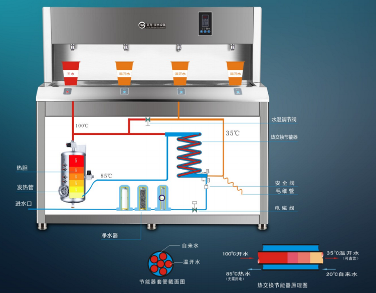自來水管→自來水→凈化水→熱交換器(內管)→加熱至85°C→水膽加熱→100°C開水只需加熱15°C→開水直飲